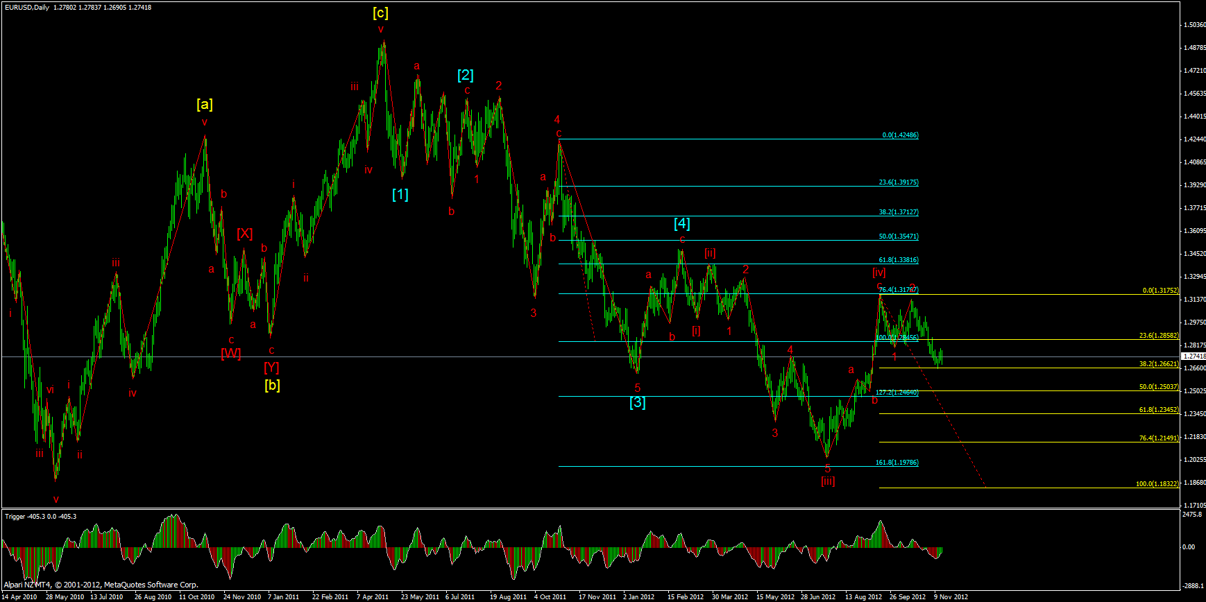 Долгосрочный сценарий остается без изменений. Развивается волна С растянутой волновой плоскости. Первая волна волны С представлена начальным расширяющимся клином.